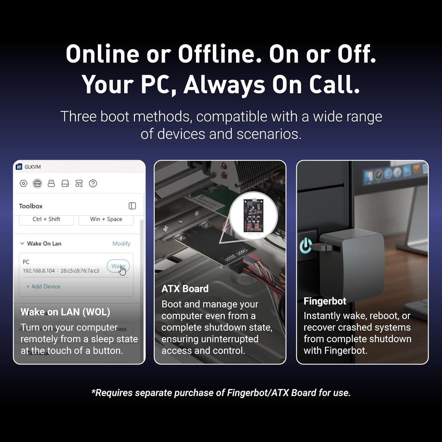 【Flexible Remote Access】Remote access can be achieved through our web based cloud control functionality, supporting Windows, macOS, and Linux systems without needing to install any software. Additionally, there is remote support via the GLKVM app available to Windows, macOS, iOS and Android devices.