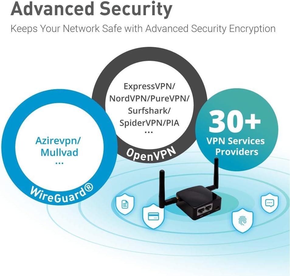 OpenWRT is pre-installed and backed with a repository of 4000+ software packages. Pre-installed with an OpenVPN client, it works with 20+ VPN service providers.