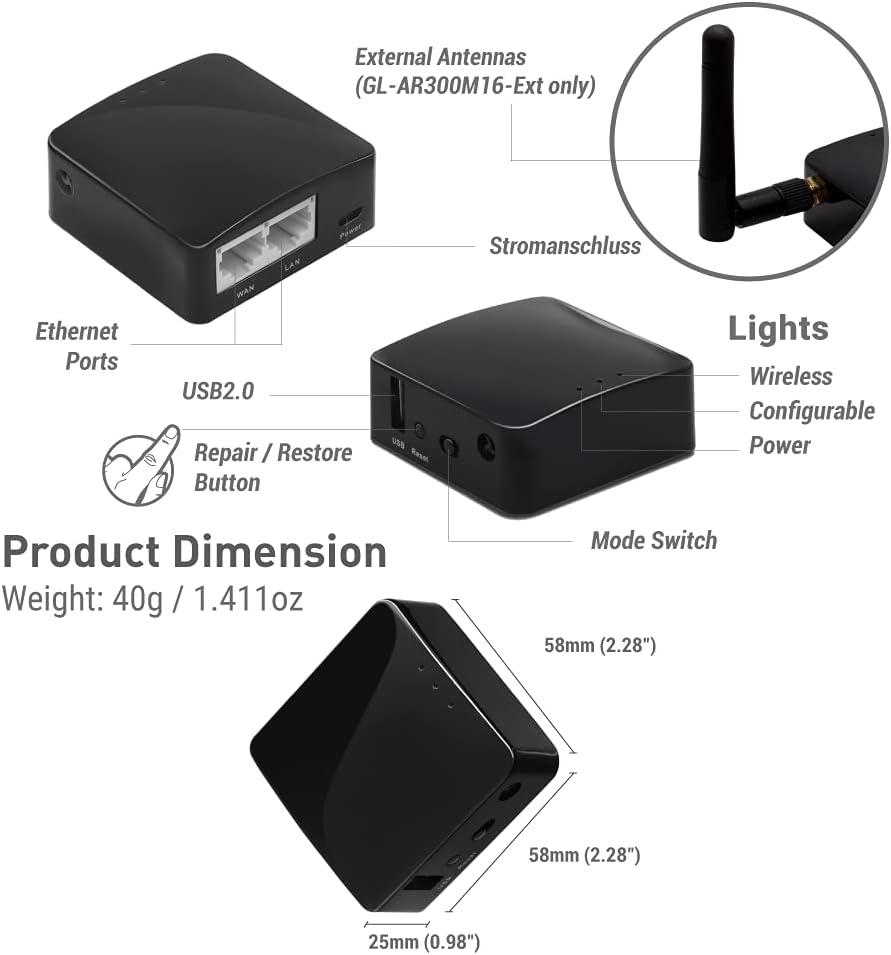 GL.iNET GL-AR300M (Shadow) Mini VPN Travel Router with 2dbi External Antenna, Wi-Fi Converter, Mobile Hotspot in Pocket, OpenWrt, Repeater Bridge, 300Mbps, 128MB Nand Flash, OpenVPN (Renewed)