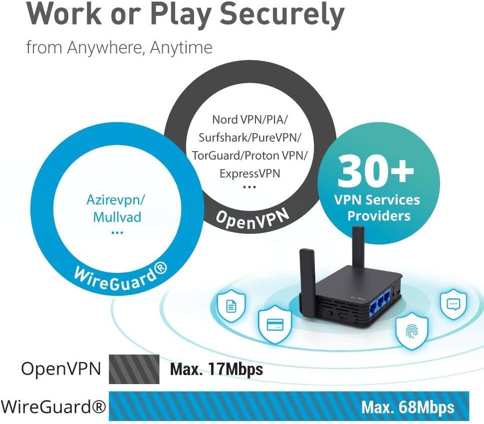 Got a commercial VPN provider that you really like? No problem, there’s more than 30+ VPNs compatible with our pre-installed OpenVPN client. OpenVPN is a tried-and-true software, and a common standard for security-minded VPN users. WireGuard is based on a concept called Cryptokey Routing. This is an impressive new technology that’s worth trying if you’re looking for performance boosts beyond what OpenVPN can provide. It’s a much faster security protocol than OpenVPN; WireGuard VPN can clock 68Mbps, compared to OpenVPN that can only hit 17Mbps.