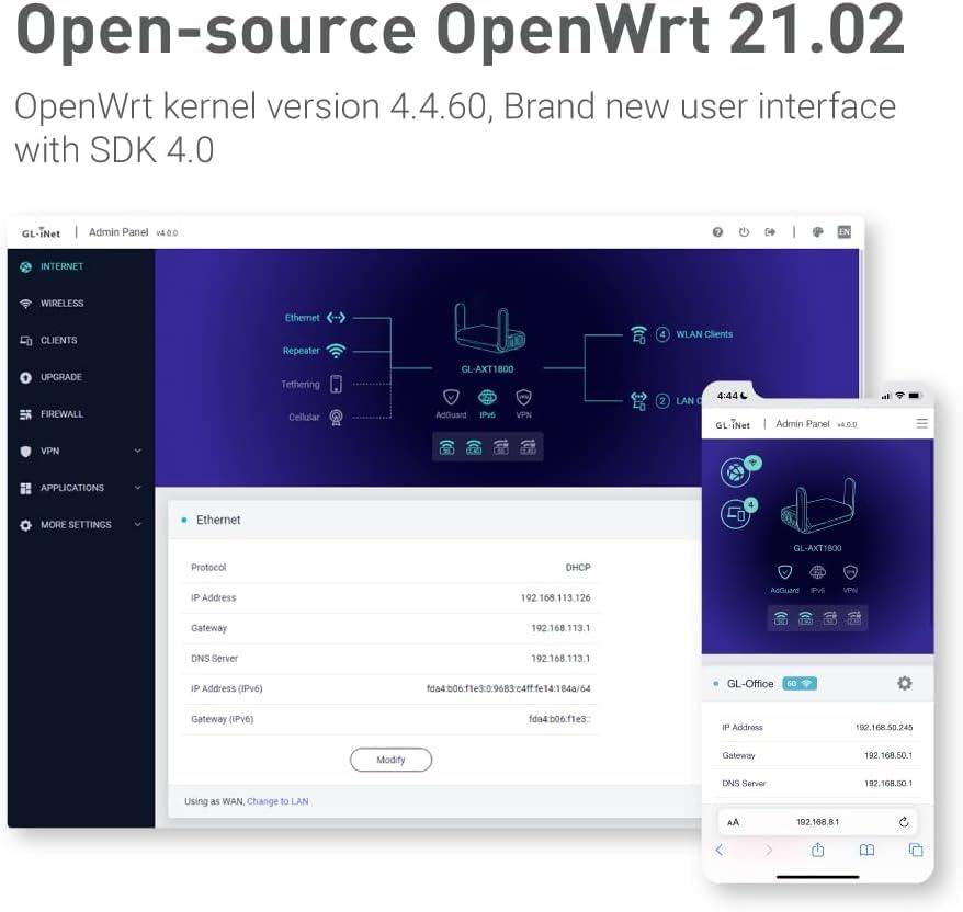 【Runs on OpenWrt 21.02】Slate AX runs on the latest OpenWrt 21.02 operating system (Kernel version 4.4.60), with mass device connection capabilities, and significantly reduced signal interference. You can customize the router and install applications based on your preferences.