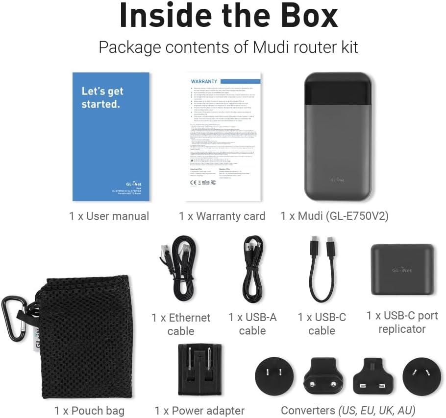 【PACKAGE CONTENTS】GL-E750V2 (Mudi) router with 2-year warranty, USB-C to USB-A cable, USB-C to USB-C cable, USB-C port replicator, Power adapter (US, EU, UK, AU Plugs), EM060K Cat6 4G module pre-installed, Ethernet cable, User manual.