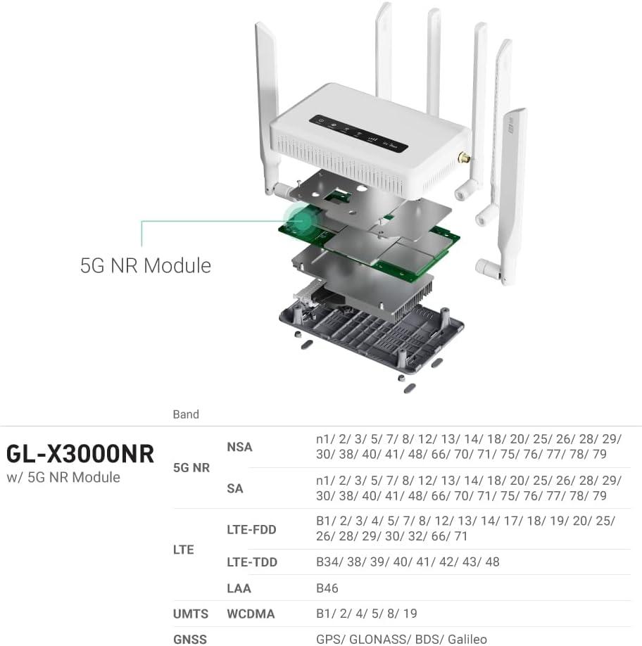 【Fast Wi-Fi 6 Cellular Router】GL-X3000 provides reliable cellular networks for remote access and high speed internet in urban areas with up to 574Mbps (2.4GHz) + 2402Mbps (5GHz) Wi-Fi speeds. Supports MU-MIMO technology for simultaneous wireless network connections in different scenario. *Speed Tests conducted on a local network. Real world speeds may differ depending on your network configuration.